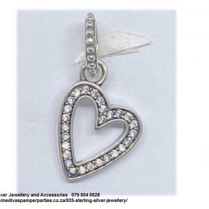 925 Sterling Silver Free Hand Heart Dangle Cubic Detail Charm Bead. European Style Bracelet Compatible
