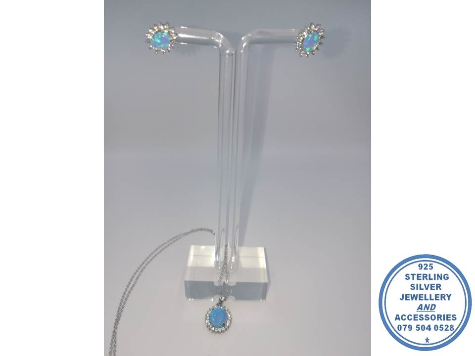 925 Sterling Silver Blue Opal Necklace Pendant with 42cm Chain only. Exc Earrings