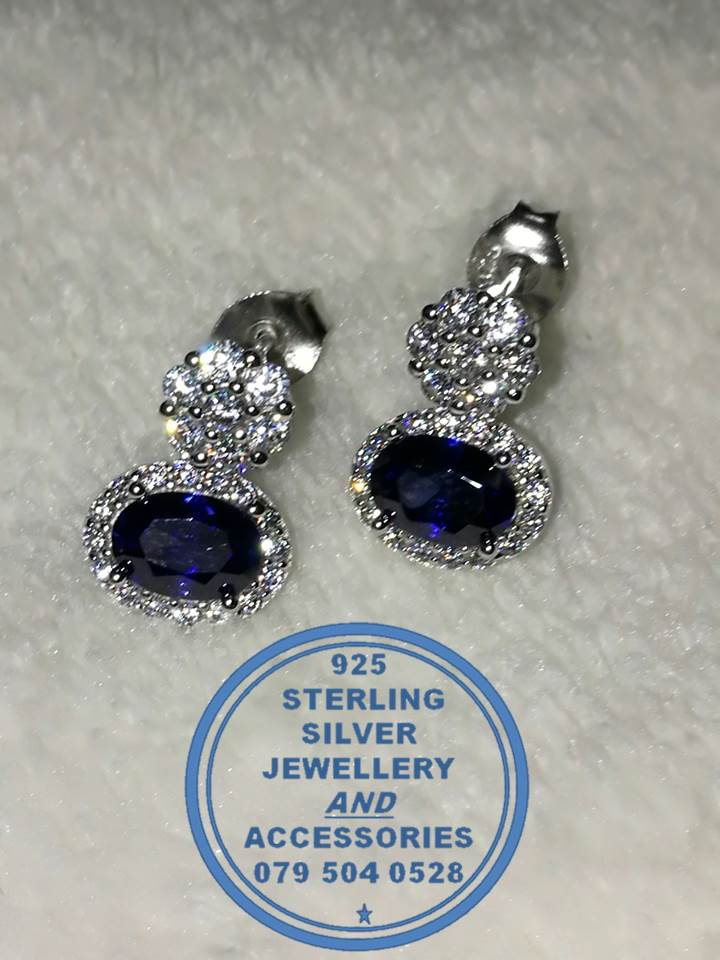 925 sterling Silver Dangle Stud Earrings with oval Blue bottom on a clear stud surrounded by clear cubics