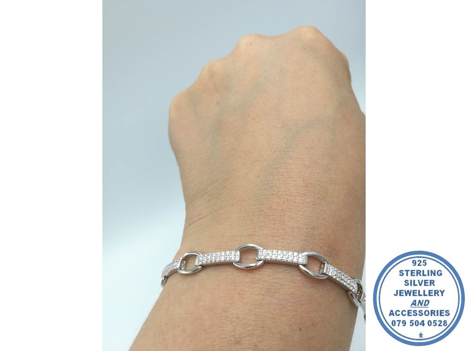 925 Sterling Silver Designer’s Bracelet Clear Cubic Rectangular Strips with open oval links max 19- 21cm