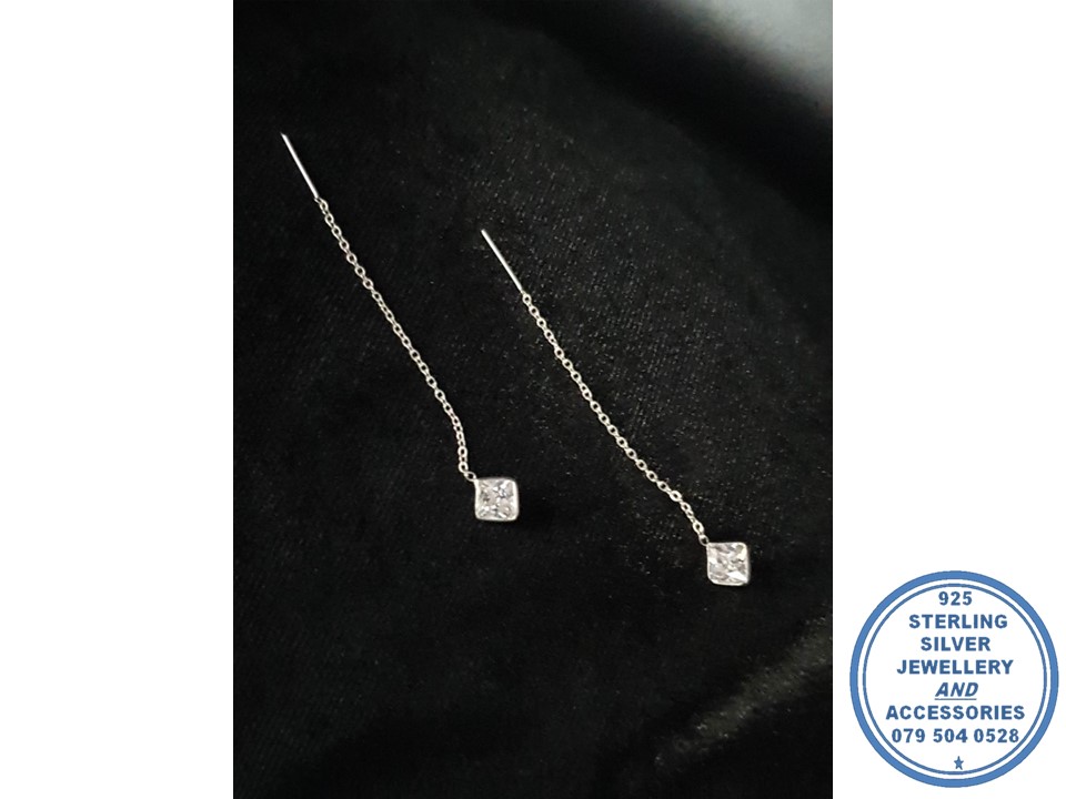 925 Sterling Silver Trendy Chain Clear Zirconia Square Earrings