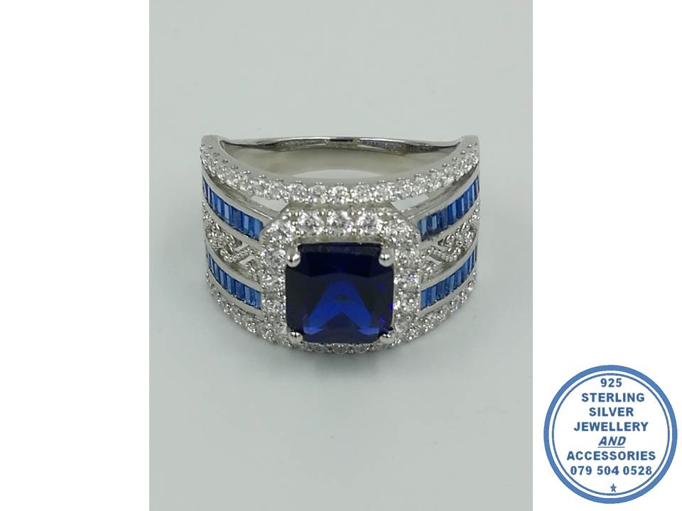 Designers Halo Blue Center Square Cubic Ring with 2 Blue Baguette rows downs the sides. 925 Sterling Silver